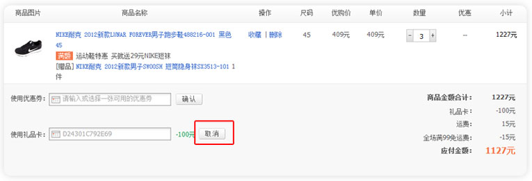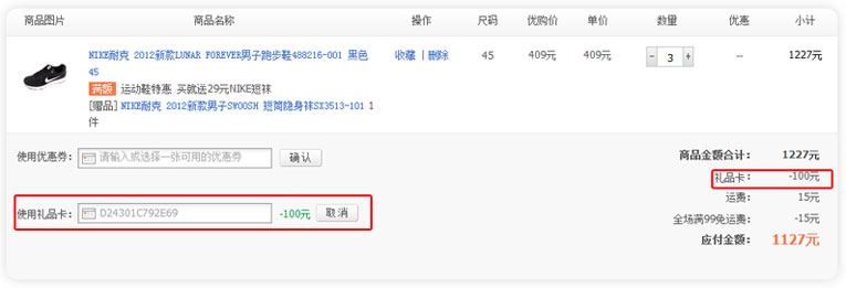 (2)如果您不想使用系统默认的礼品卡,请点击“取消”按钮。取消后可以输入或者选用其它可用礼品卡。