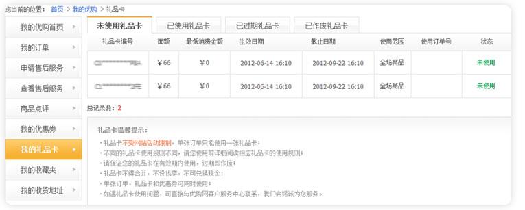 登陆后在“我的优购—>我的礼品卡”里查看礼品卡编码、状态和有效期。