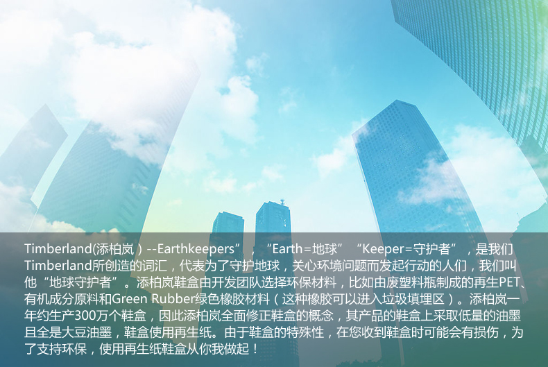 Timberland(添柏岚),纯美式风格品牌,坚持适合户外需求及坚持可持续发展为原则,创造富有创新精神、经得起户外考验、外观漂亮且经久耐用的产品。品牌发展起源深受美国新英格兰地区的影响,包括当地极端多变的天气情况、丰富多样的地貌环境以及当地人民勇于创新及解决问题的精神。添柏岚的经典,为每一个真正热爱户外的人,提供坚固耐用,功能性强,粗犷,实用的装备,从而让你得到最丰富的户外体验。