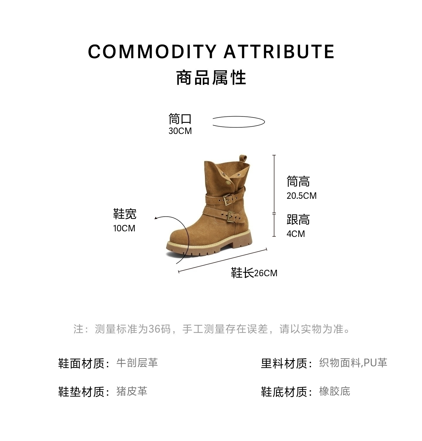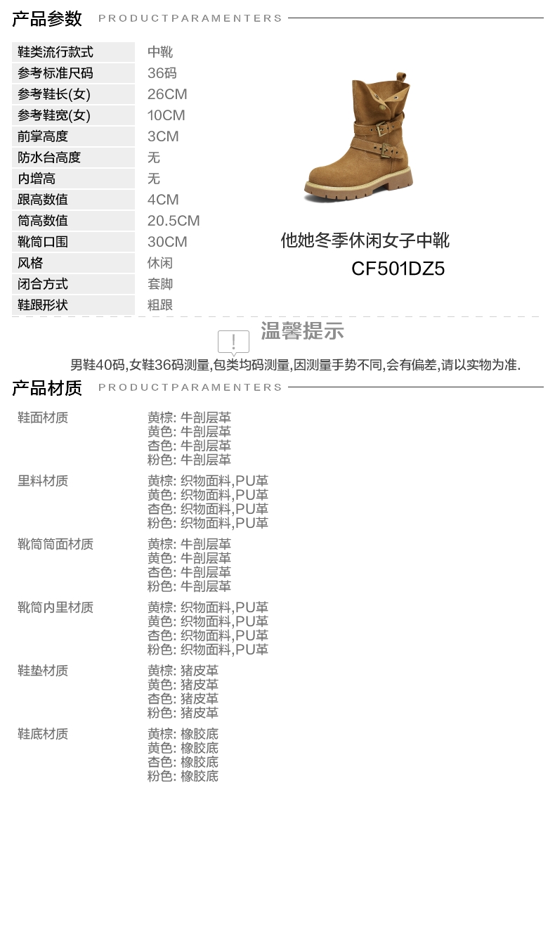 | 配跟:有 | 靴筒口围:30CM | 上市时间:2025年冬季 | 鞋类流行款式:中靴 | 鞋头款式:圆头 |
